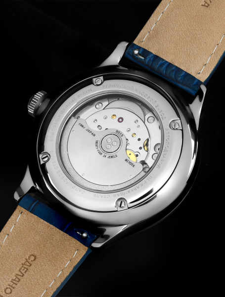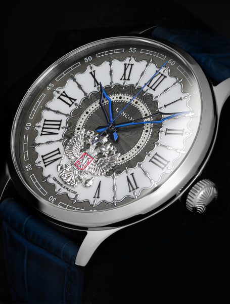 Мужские наручные часы, выполненные в винтажном стиле, вдохновлённые эпохой расцвета ампира. С начала XIX века стиль ампир с его строгостью, изяществом и монументальностью служил идее подчеркнуть величие и мощь Российской империи. Дизайн циферблата, декорированного волнообразным гильоше и чеканным знаком в виде главного символа нашей страны, позволяет проникнуться красотой и могуществом российского государства.