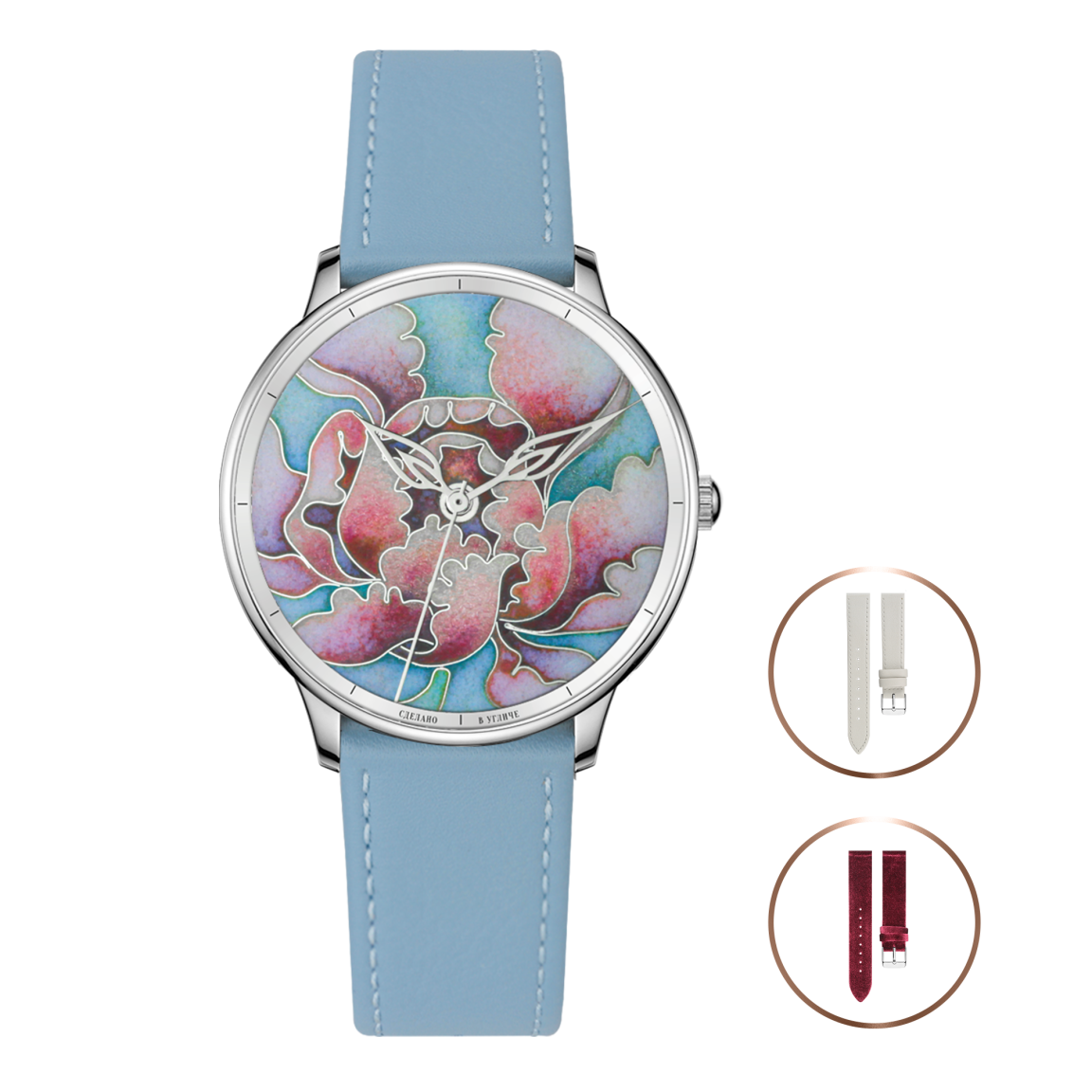 Циферблаты часов вручную изготавливаются в старинной технике горячей перегородчатой эмали, которая поражает тонкостью исполнения и завораживающими цветовыми переходами. Благодаря искусной работе мастера и магической силе огня цветной стекловидный порошок (эмаль), заполняющий тончайшие перегородки, превращается в настоящий шедевр. Технология исполнения настолько трудоёмкая, что повторить все мельчайшие элементы узора в точности невозможно, поэтому каждое изделие коллекции обладает своим собственным неординарным характером.Обратите внимание: