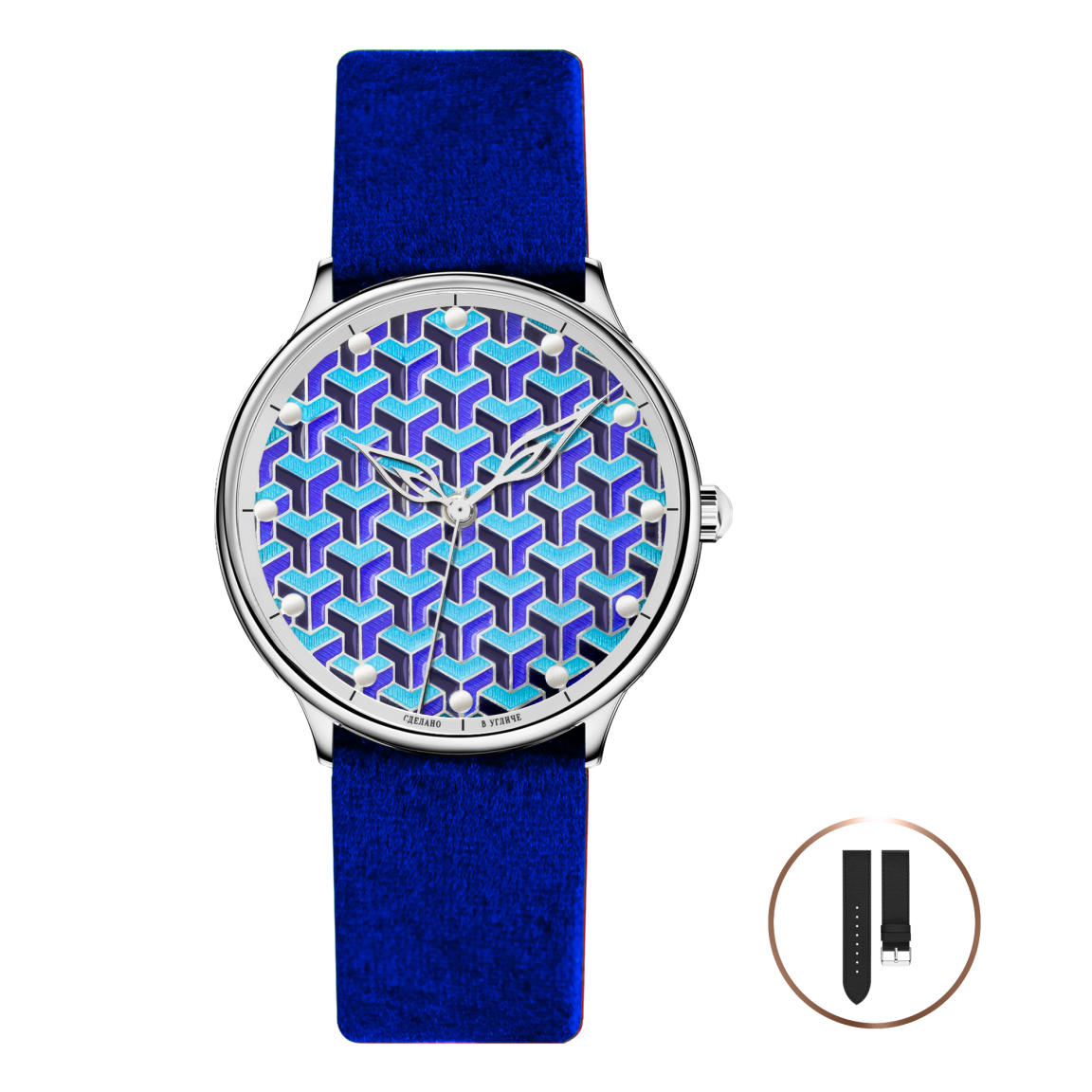 Для декорирования часов из коллекции “Эмили” мы обратились к традиционной ювелирной технике выемчатой эмали. Чтобы эмаль заиграла яркими красками и наполнилась сияющим блеском, мастерам необходимо выполнить множество операций. Сначала на серебряной пластине методом резьбы или штамповки создаётся ажурная структура, для придания дополнительной глубины рисунку также применяется гильош (штриховка на металле резцом), затем получившиеся ячейки постепенно заполняют эмалью, подвергая каждый её слой обжигу, после чего изделие полируется. В результате получается яркое, переливающееся на свету изображение, напоминающее красочные витражи.