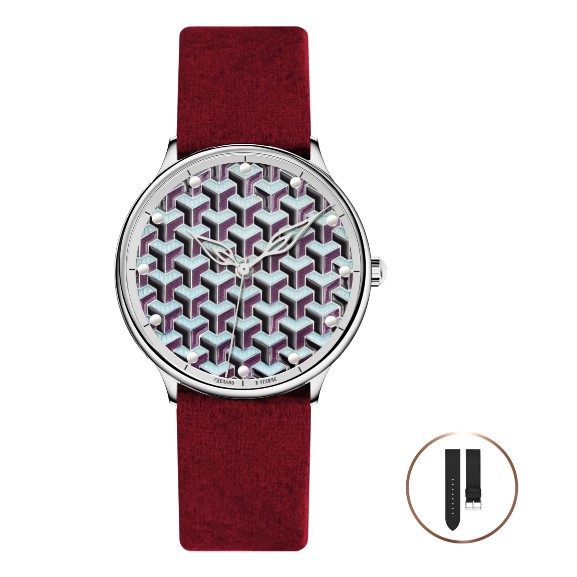 Для декорирования часов из коллекции “Эмили” мы обратились к традиционной ювелирной технике выемчатой эмали. Чтобы эмаль заиграла яркими красками и наполнилась сияющим блеском, мастерам необходимо выполнить множество операций. Сначала на серебряной пластине методом резьбы или штамповки создаётся ажурная структура, для придания дополнительной глубины рисунку также применяется гильош (штриховка на металле резцом), затем получившиеся ячейки постепенно заполняют эмалью, подвергая каждый её слой обжигу, после чего изделие полируется. В результате получается яркое, переливающееся на свету изображение, напоминающее красочные витражи.
