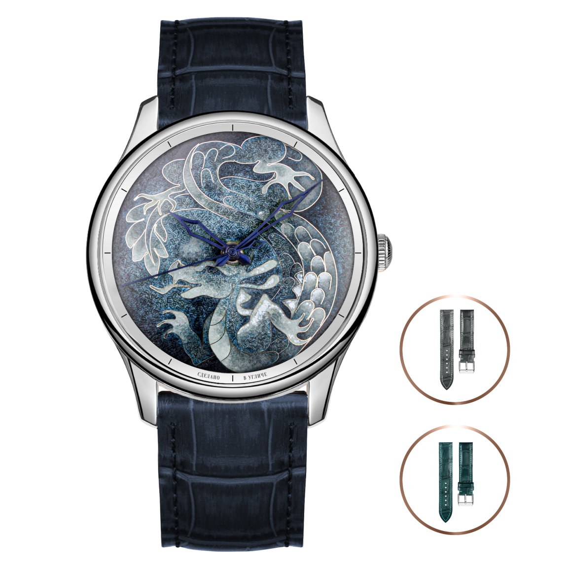 Прочное сапфировое стекло надёжно защищает искусно выполненный вручную эмалевый циферблат и скрытый под ним надёжный японский механизм Miyota, с ротора которого за вами будет приглядывать покровитель 2024 года - Зелёный Деревянный Дракон!