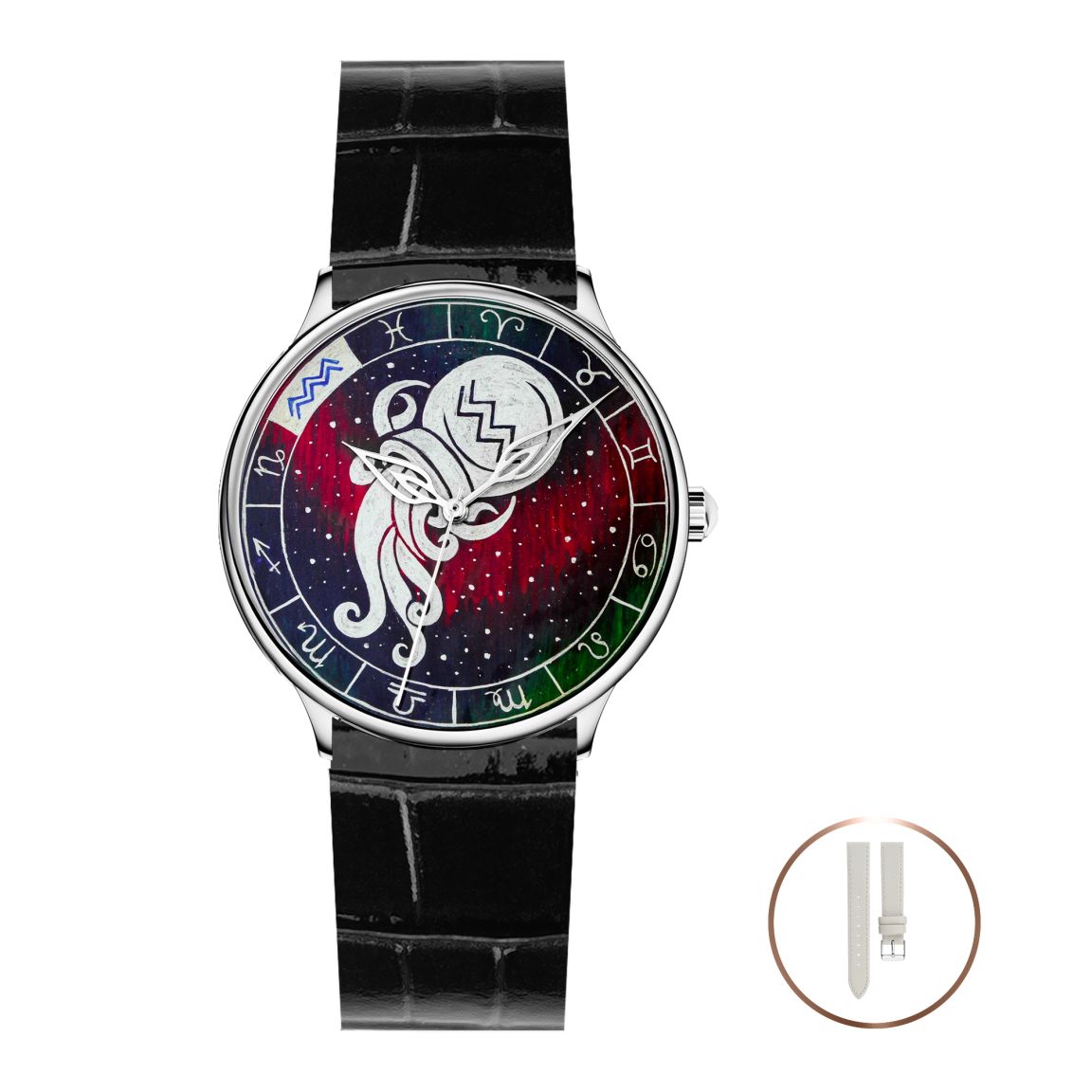 Мистический мир Зодиака в коллекции наручных часов, где каждый уникальный циферблат - миниатюрная картина, вдохновлённая символикой знаков зодиака и искусно нанесённая вручную в технике палехской лаковой миниатюры. Мы перенесли 12 созвездий знаков зодиака, которые с древности являлись инструментом для определения времени и времён года и были способом отражения космического порядка в человеческой жизни, на наши изделия - наручные часы - приборы, измеряющие неподвластное время, подчинённое законам числа 12. Пусть изображение знака зодиака станет верным талисманом на вашем запястье, сопровождающим вас каждую секунду времени.