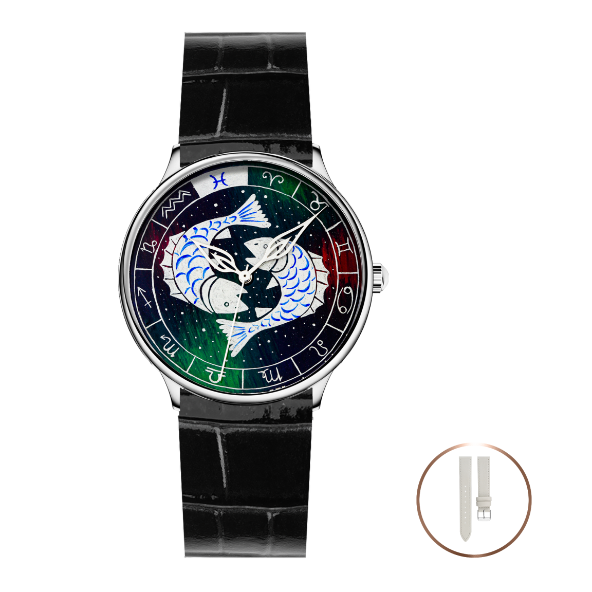 Мистический мир Зодиака в коллекции наручных часов, где каждый уникальный циферблат - миниатюрная картина, вдохновлённая символикой знаков зодиака и искусно нанесённая вручную в технике палехской лаковой миниатюры. Мы перенесли 12 созвездий знаков зодиака, которые с древности являлись инструментом для определения времени и времён года и были способом отражения космического порядка в человеческой жизни, на наши изделия - наручные часы - приборы, измеряющие неподвластное время, подчинённое законам числа 12. Пусть изображение знака зодиака станет верным талисманом на вашем запястье, сопровождающим вас каждую секунду времени.