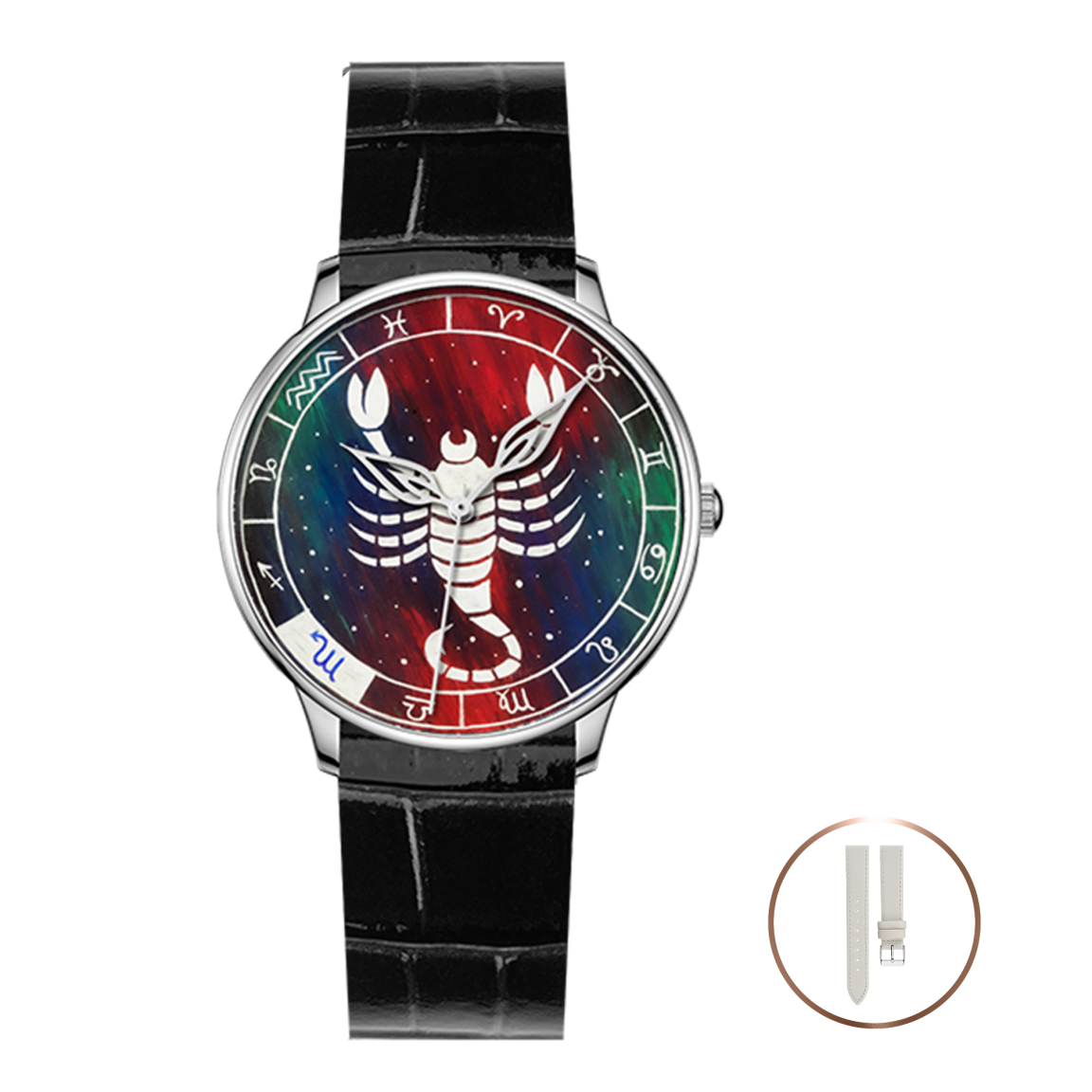 Мистический мир Зодиака в коллекции наручных часов, где каждый уникальный циферблат - миниатюрная картина, вдохновлённая символикой знаков зодиака и искусно нанесённая вручную в технике палехской лаковой миниатюры. Мы перенесли 12 созвездий знаков зодиака, которые с древности являлись инструментом для определения времени и времён года и были способом отражения космического порядка в человеческой жизни, на наши изделия - наручные часы - приборы, измеряющие неподвластное время, подчинённое законам числа 12. Пусть изображение знака зодиака станет верным талисманом на вашем запястье, сопровождающим вас каждую секунду времени.