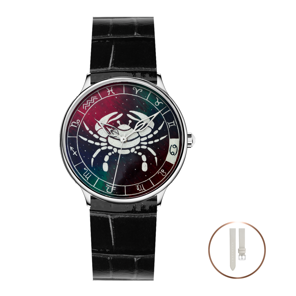 Ремешок из натуральной итальянской кожи с имитацией крокодила оснащён быстросъёмными шпильками для лёгкой замены без дополнительных инструментов и классической застёжкой, позволяющей быстро отрегулировать его по запястью.