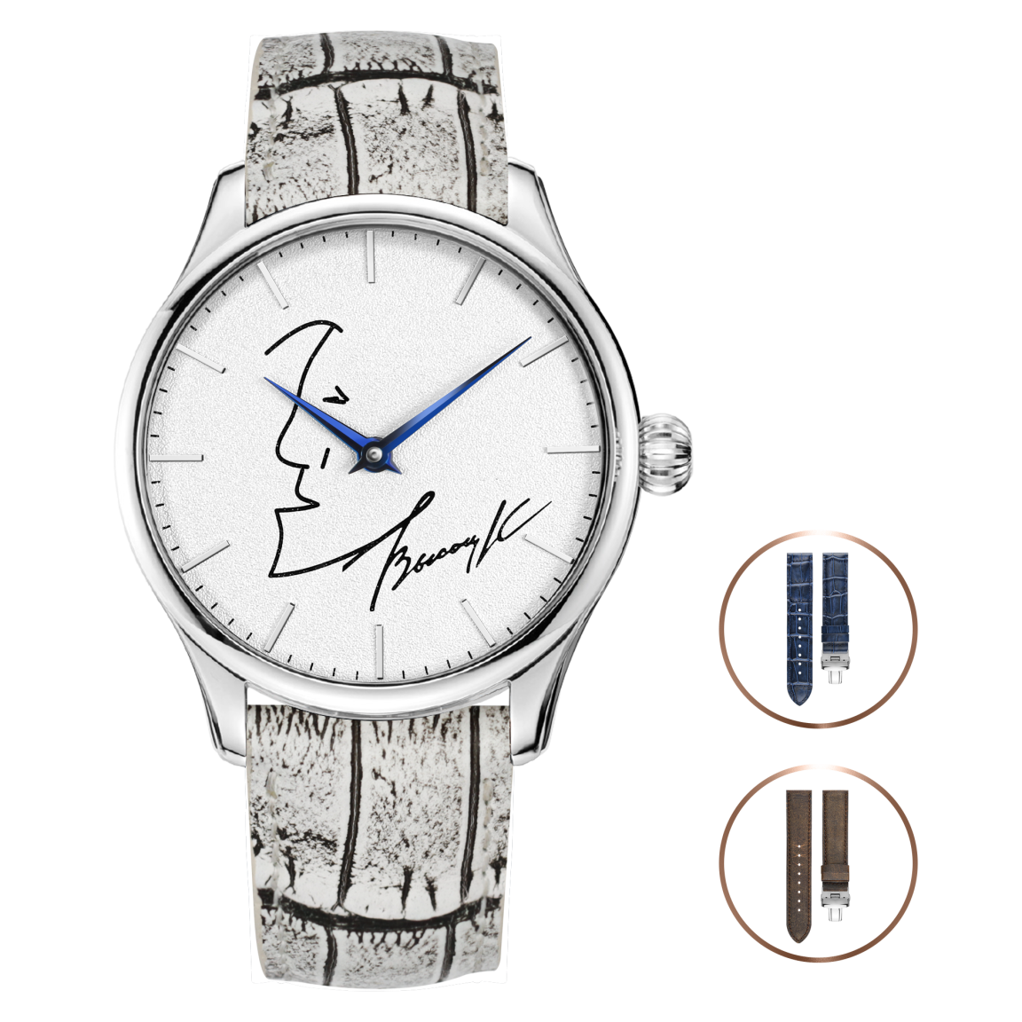 Часы комплектуются ремнём ручной работы из натуральной кожи крокодила, а также двумя дополнительными ремнями из натуральной итальянской кожи. Все ремешки оснащены быстросъемными штифтами и пряжками-бабочками.