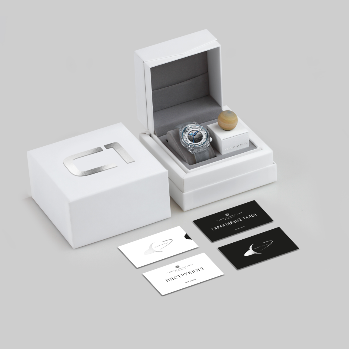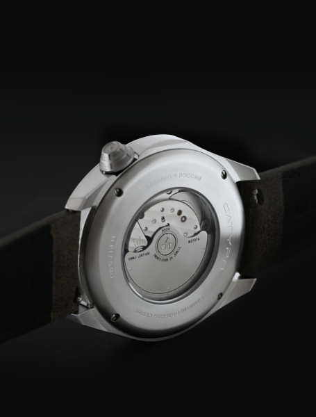 Корпус часов, сбоку которого установлена переводная головка, выполненная в форме космического аппарата, изготовлен из прочной нержавеющей стали. Устойчивое к появлению царапин куполообразное сапфировое стекло, так напоминающее люк иллюминатора, защищает циферблат и надёжный японский механизм с функцией автоподзавода и запасом хода 42 часа Miyota 9039, за работой которого можно наблюдать сквозь прозрачную заднюю крышку.