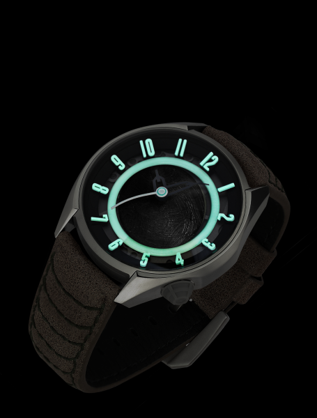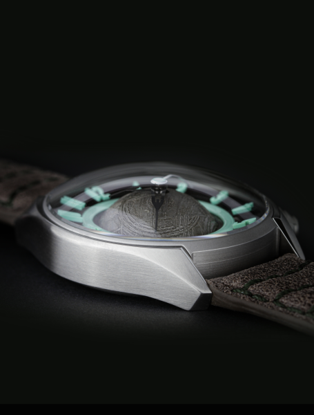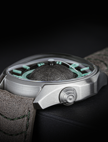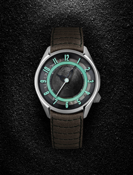 На циферблате расположена полусфера, изготовленная из метеорита Муонионалуста, найденного более 1 миллиона лет назад на границе Финляндии с Швецией. Благодаря люминесцентному покрытию SuperLuminova крупные арабские цифры, расположенные вокруг планеты, имеют ярко-синее свечение в темноте. Ремешок, изготовленный из натуральной кожи, оснащён быстросъемными штифтами, что позволяет производить его замену без каких-либо специальных инструментов.