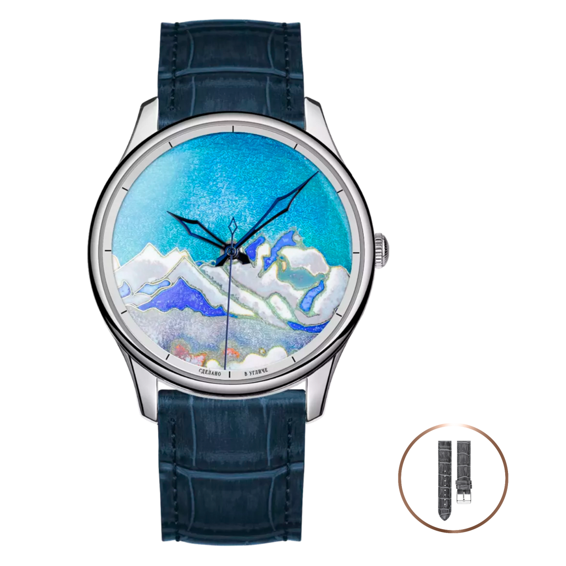 Именно эту загадочную симфонию цвета и света мы попытались изобразить на циферблате модели коллекции Соло, выполненном в старинной технике горячей перегородчатой эмали, завораживающей своей игрой красок как и полотна великого мастера. Клиновидные воронёные стрелки перекликаются с острыми пиками величественных гор и прекрасно сочетаются с тёмно-синим оттенком ремешка, выполненного из натуральной кожи. В сердце часов скрыт надёжный высокоточный механизм Miyota 9015 с автоматическим подзаводом и 24 камнями, обеспечивающий запас хода 42 часа, за работой которого можно наблюдать сквозь прозрачную заднюю крышку.