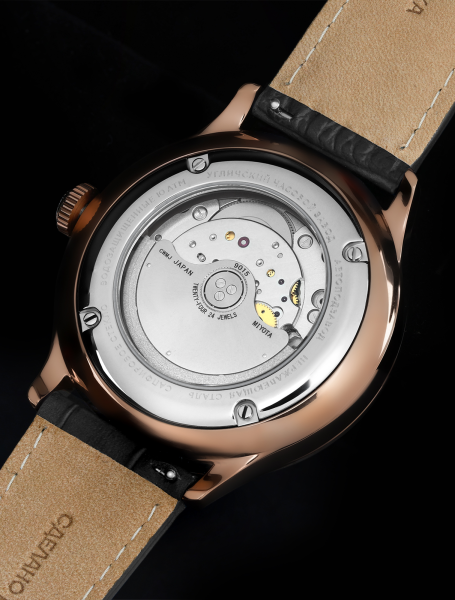 • За точность хода и бесперебойную работу часов отвечает японский механизм премиального качества Miyota 9015 с функцией автоматического завода и запасом хода 35 ч. Вид на его завораживающую работу открывается сквозь прозрачную заднюю крышку.