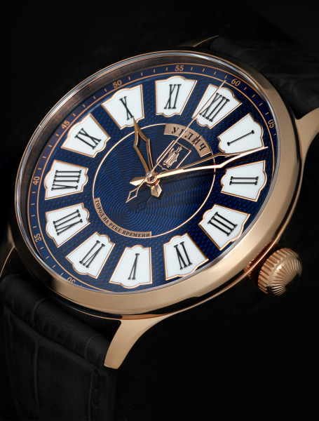 • Циферблат, декорированный волнообразным гильоше и чеканным знаком в виде главного символа нашей страны, позволяет проникнуться красотой и могуществом российского государства.