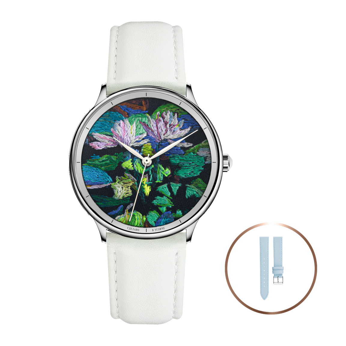 Коллекция Этника стала результатом кропотливого труда угличских часовщиков и мастера по вышивке Владимира Кузнецова. Он украсил часы самобытными и безумно детализированными фактурными работами. Когда нити переливаются на свету, миниатюрные картины становятся особенно прекрасны. Благодаря таланту угличского мастера циферблаты часов не просто заиграли красками и приобрели необычный дизайн, а стали настоящими произведениями искусства. Владимир Кузнецов занимается вышивкой более 20-ти лет и является настоящим профессионалом своего дела. Он стал автором проекта «Угличское шитьё» и обладателем президентского гранта. Сегодня Владимир возрождает традиции шитья, возникшие в Угличе ещё в XVI веке. Мы по-настоящему гордимся, что в совместно с Владимиром удалось создать надёжные часы, оригинальный дизайн которых будет ежедневно радовать своих обладательниц.