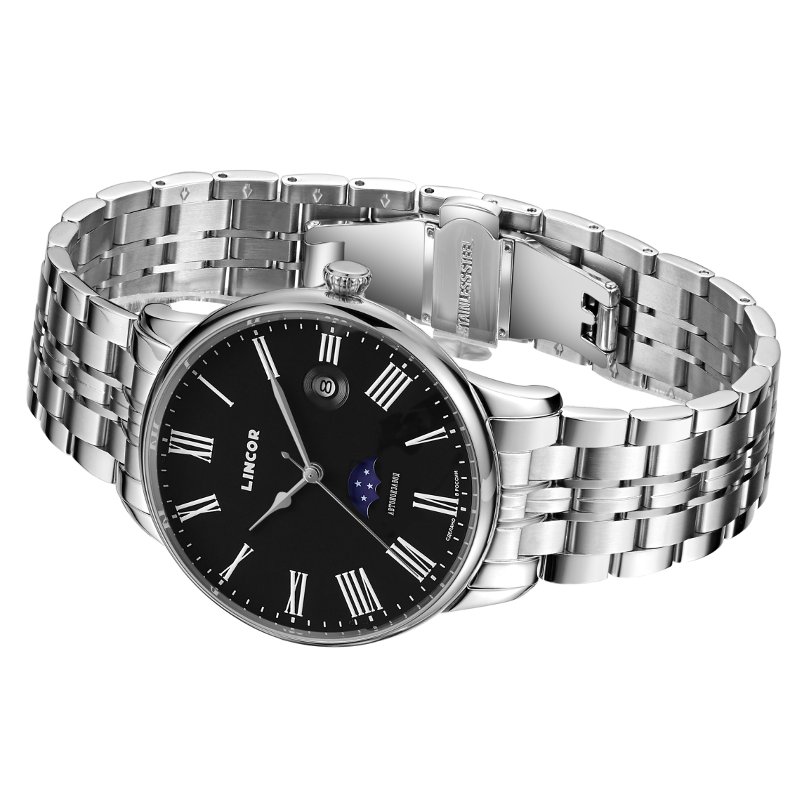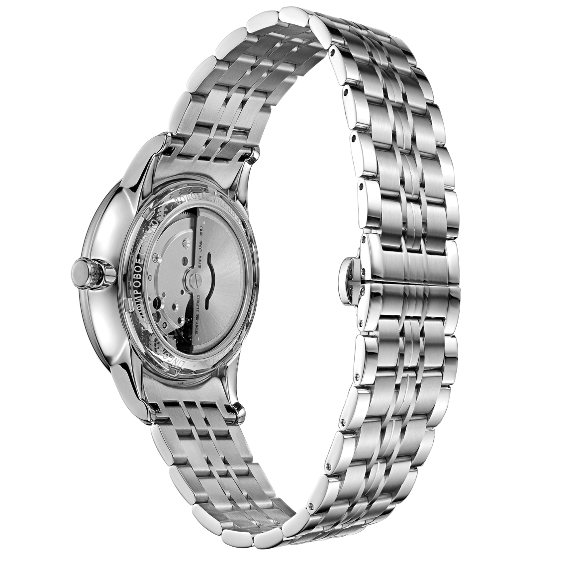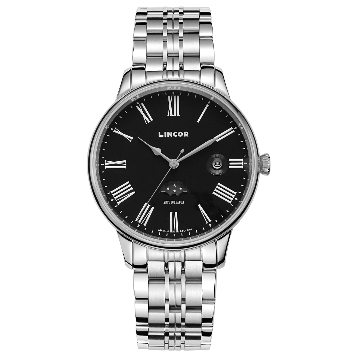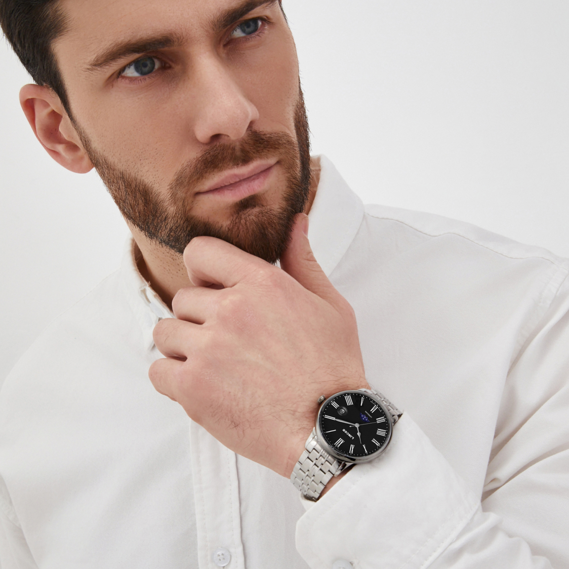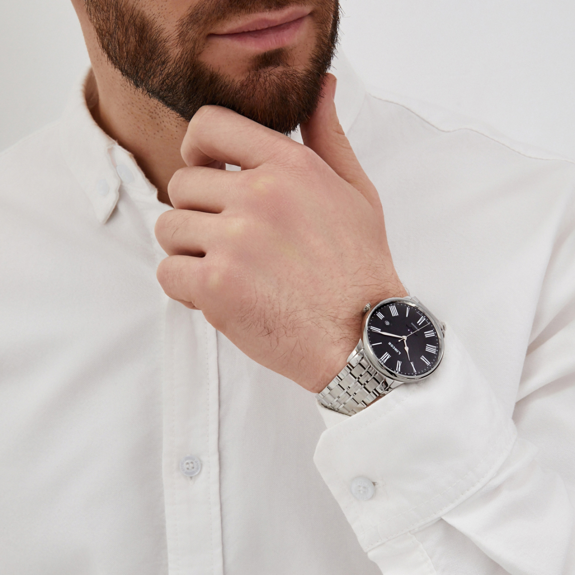 Классическая мужская модель механических часов с автоподзаводом идеально подойдет под любой обхват запястья благодаря универсальному размеру 41 мм. Корпус, изготовленный из нержавеющей стали,  с повышенной водонепроницаемостью 5 АТМ оснащён устойчивым к появлению царапин сапфировым стеклом и дополнен прозрачной задней крышкой, сквозь которую открывается вид на работу надёжного японского механизма Miyota 8205 с функцией автоподзавода и запасом хода 42ч. Лаконичный циферблат с крупными римскими индексами, обеспечивающими лёгкую читаемость показаний времени, дополнен календарным окошком и функцией определения дня недели. Количество звезд, расположенных в окошке, указывает на текущий день недели. Стальной браслет с матовой и глянцевой полировкой звеньев оснащён удобной застёжкой-бабочкой.