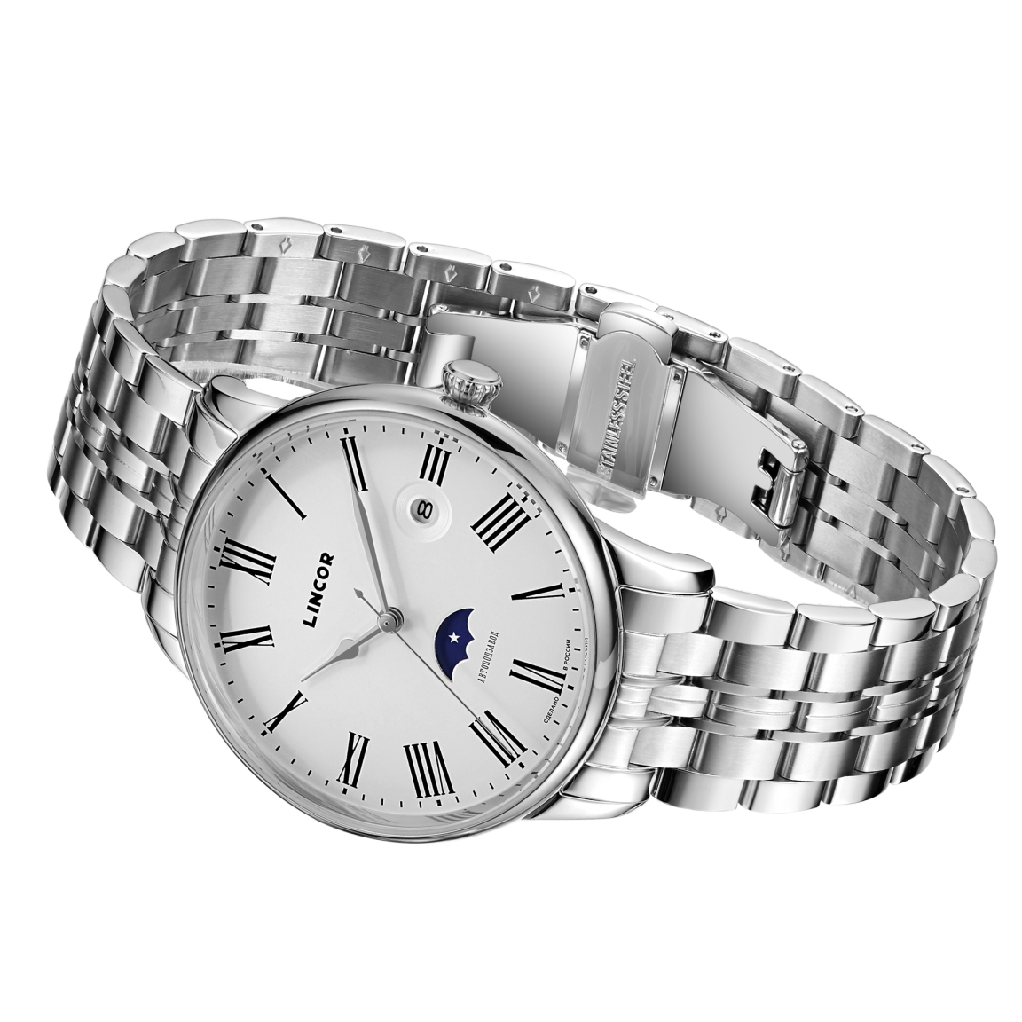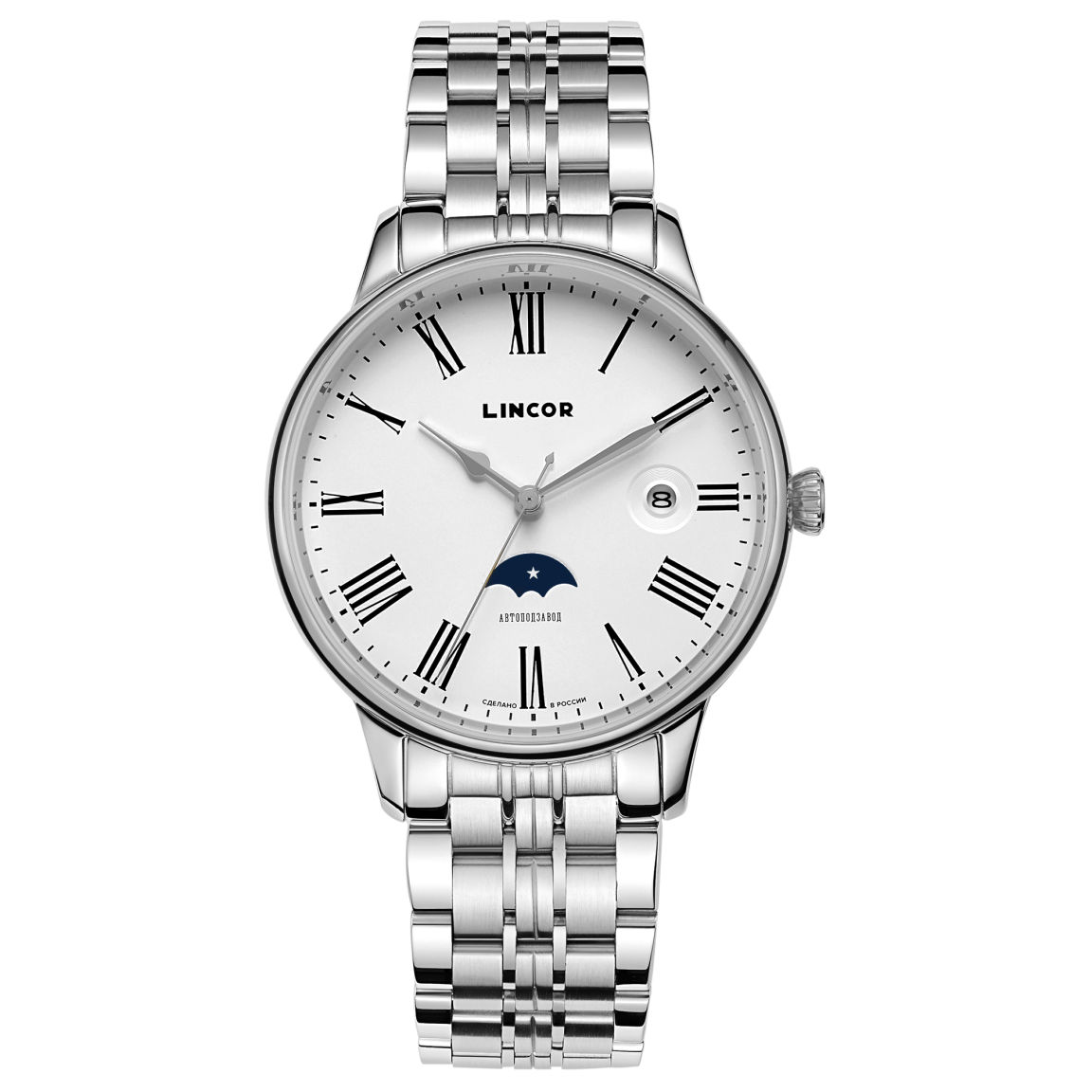 Классическая мужская модель механических часов с автоподзаводом идеально подойдет под любой обхват запястья благодаря универсальному размеру 41 мм. Корпус, изготовленный из нержавеющей стали,  с повышенной водонепроницаемостью 5 АТМ оснащён устойчивым к появлению царапин сапфировым стеклом и дополнен прозрачной задней крышкой, сквозь которую открывается вид на работу надёжного японского механизма Miyota 8205 с функцией автоподзавода и запасом хода 42ч. Лаконичный циферблат с крупными римскими индексами, обеспечивающими лёгкую читаемость показаний времени, дополнен календарным окошком и функцией определения дня недели. Количество звезд, расположенных в окошке, указывает на текущий день недели. Стальной браслет с матовой и глянцевой полировкой звеньев оснащён удобной застёжкой-бабочкой.